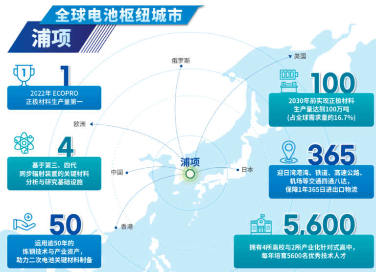 浦项市是世界上**同时生产陽极材料和负极材料材料和负极材料的城市构,建了二次电池材料全周期产业生态系统,以EcoPro、POSCO FutureM领先企业为主轴,正在跃升为二次电池材料的**生产基地。